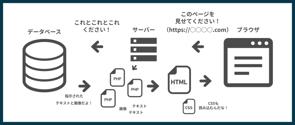ブラウザからサーバーにアクセスした後、サーバー内の対応ファイルの記述を実行します。データベースにアクセスして必要なデータを取得し、サーバーからも必要なファイルを受け取り表示するHTMLが生成されます。