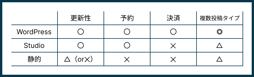 決済に関しては外部サービスのリンクに繋げるなどすればできなくはないですが、Studioの中でできる訳ではないので✕です。複数投稿タイプは料金に大きく関わるので△にしています。(後述します)