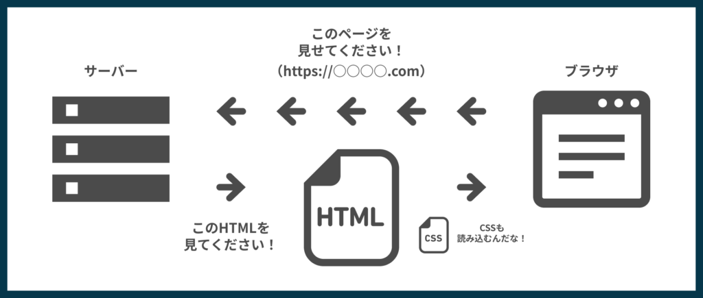 ブラウザでURLを叩くと、見たいファイルが置いてあるサーバーへアクセスし、表示するHTMLファイルを受け取ります。受け取ったHTMLファイルに書いてある指示に従ってその他に必要なCSSやJavaScriptも読み込んで画面に情報を表示させます。