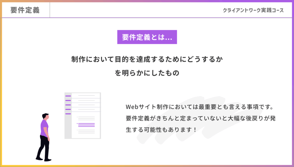 Webサイト制作の過程でのトラブルはきちんと要件を定義することで回避できるものであることが多いので、ここにいちばん力を入れるつもりで取り組みましょう。基本的にはヒアリングの結果をもとに組み立てていくので、特に新しくクライアントに何かを確認するなどは発生しません!