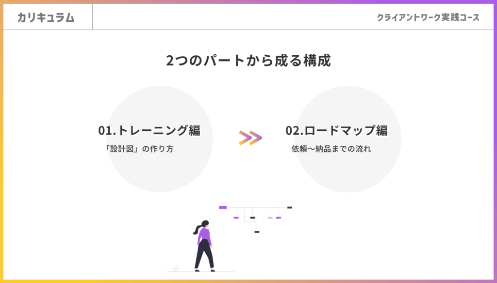 ロードマップ編はクライアントから依頼を受けて納品するまでの一連の流れを踏襲できるようになっています。ただしあくまでも一例なので案件によってはその通りにいかないこともあるかもしれません。想像のできないイレギュラーが実際に起こった場合はぜひチャットサポートにご連絡ください!