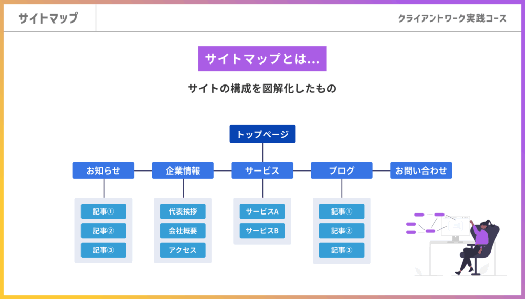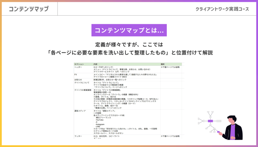 この講座ではコンテンツマップを「各ページに必要な要素を洗い出して整理したもの」として扱っていきます。