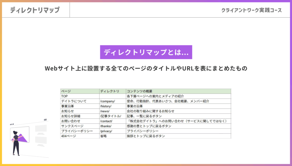 ディレクトリマップWebサイト上に設置するすべてのページのタイトルやURLを表にしてまとめたものです。